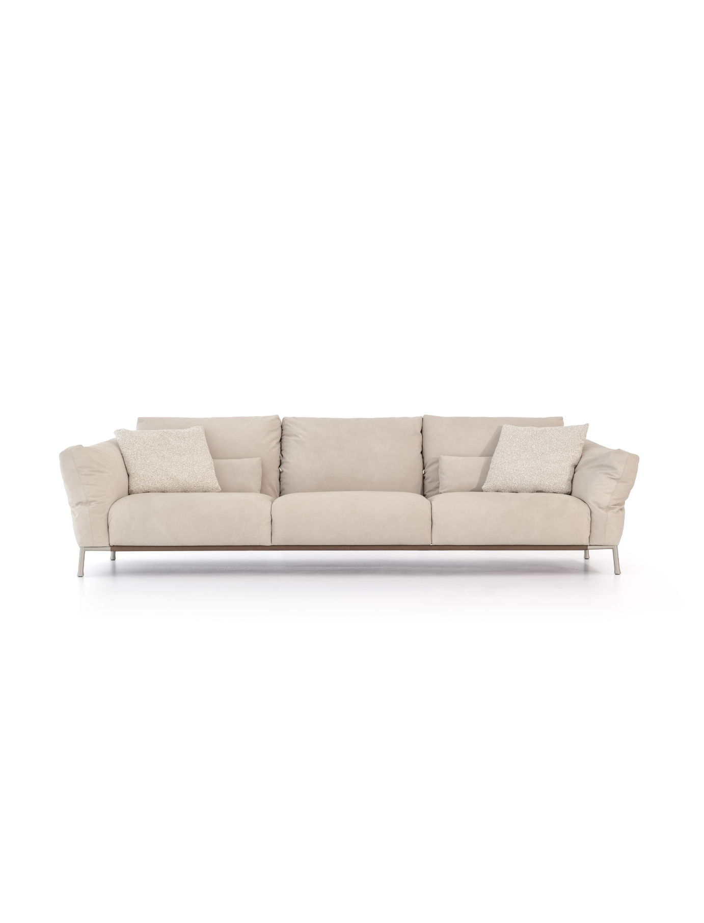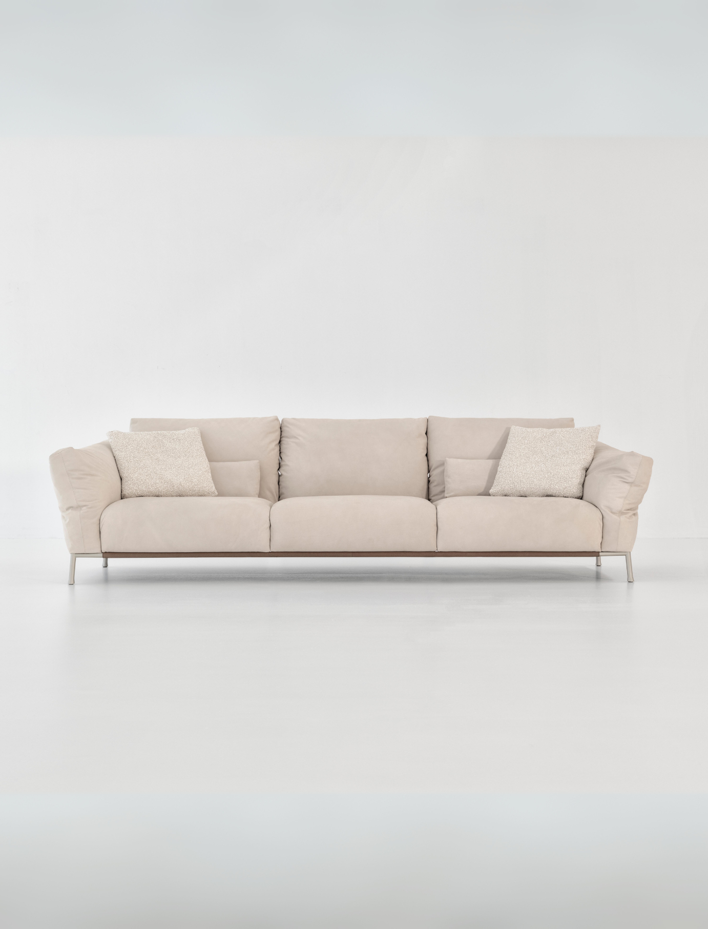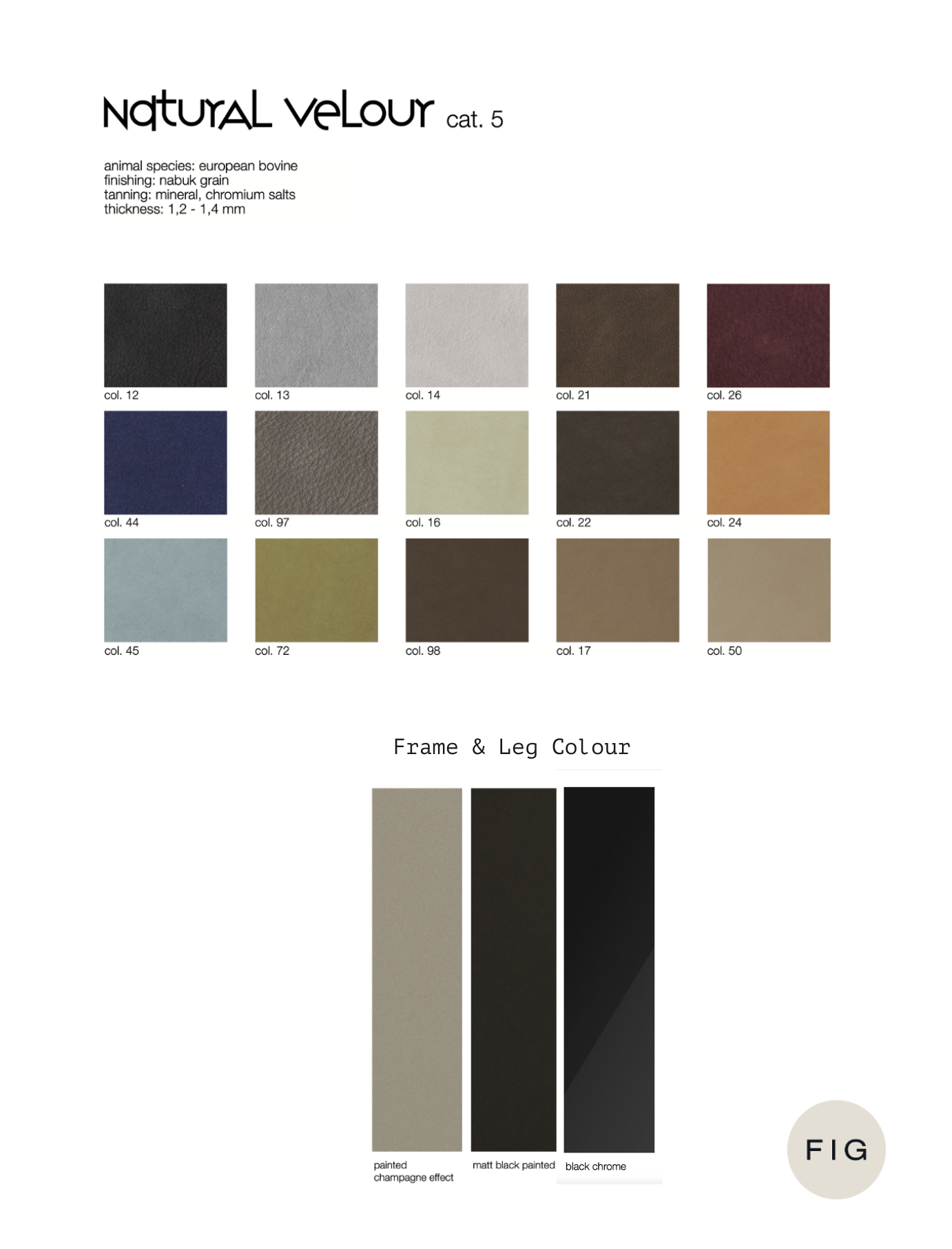 The metal feet are available in three different finishes: painted champagne effect, painted black and black chromed. The leather covering the profile is available in Soffio, Setanil and Natural Velour.