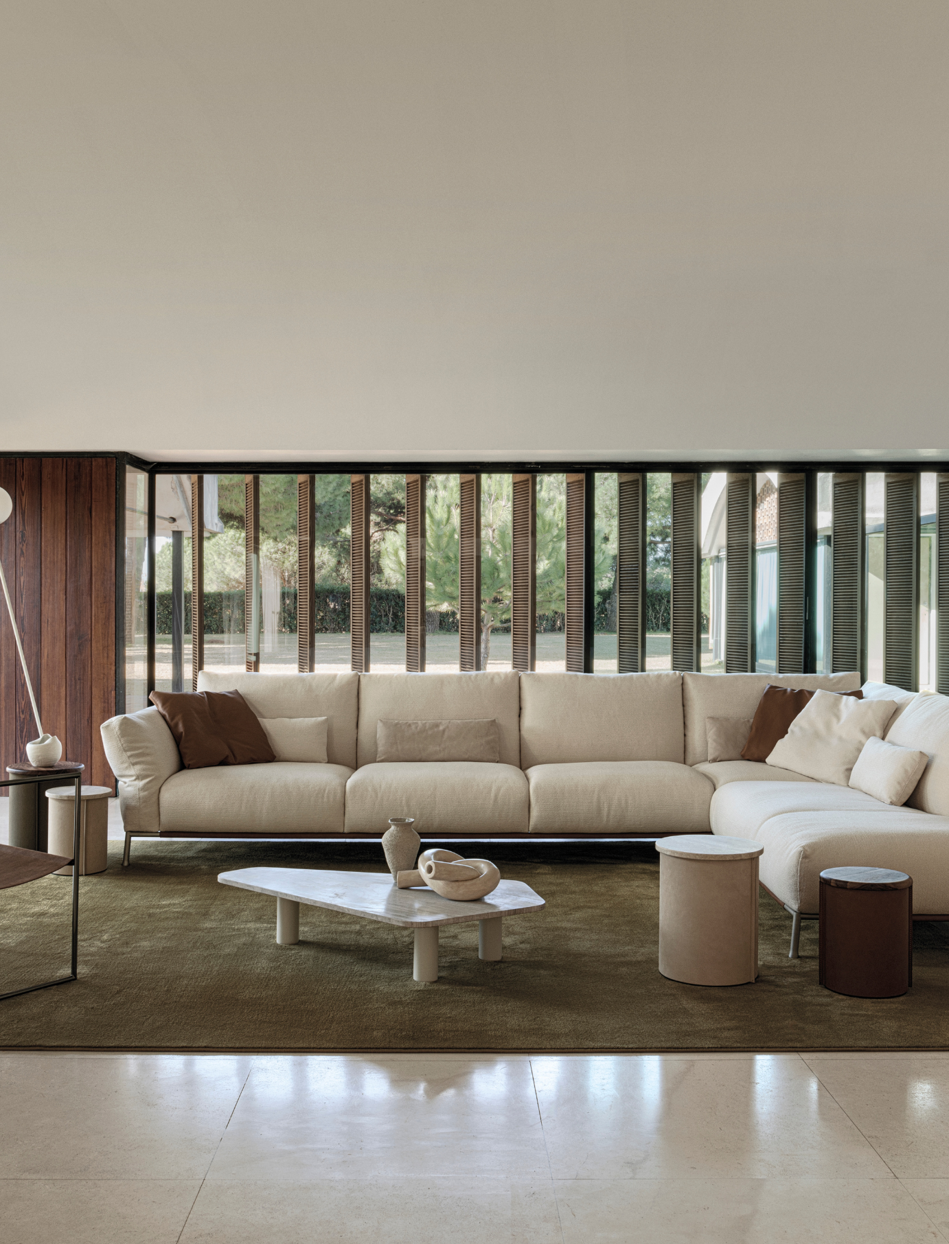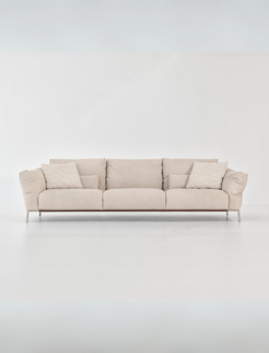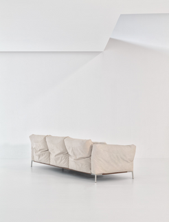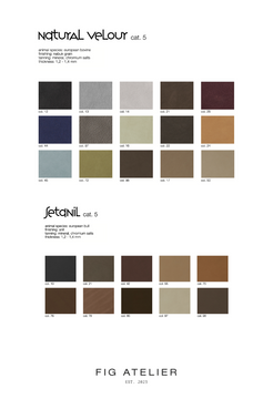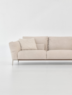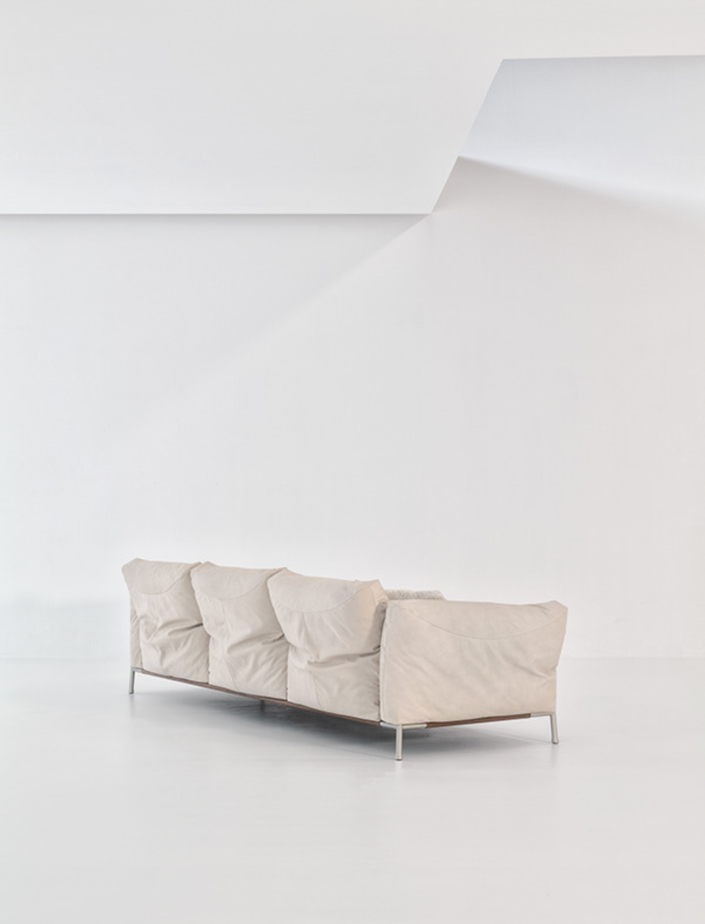 The metal feet are available in three different finishes: painted champagne effect, painted black and black chromed. The leather covering the profile is available in Soffio, Setanil and Natural Velour.