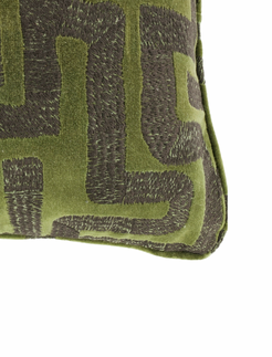 In the deeper, moodier Hunting tone, the Labyrinth cushion becomes a more expressive, statement-making piece. The raised embroidery on matte cotton velvet gains extra depth in this richer palette, with shadows and highlights playing beautifully across the surface to create visual intrigue and dimension. It’s a perfect accent cushion for grounding a space or adding a touch of dramatic contrast.