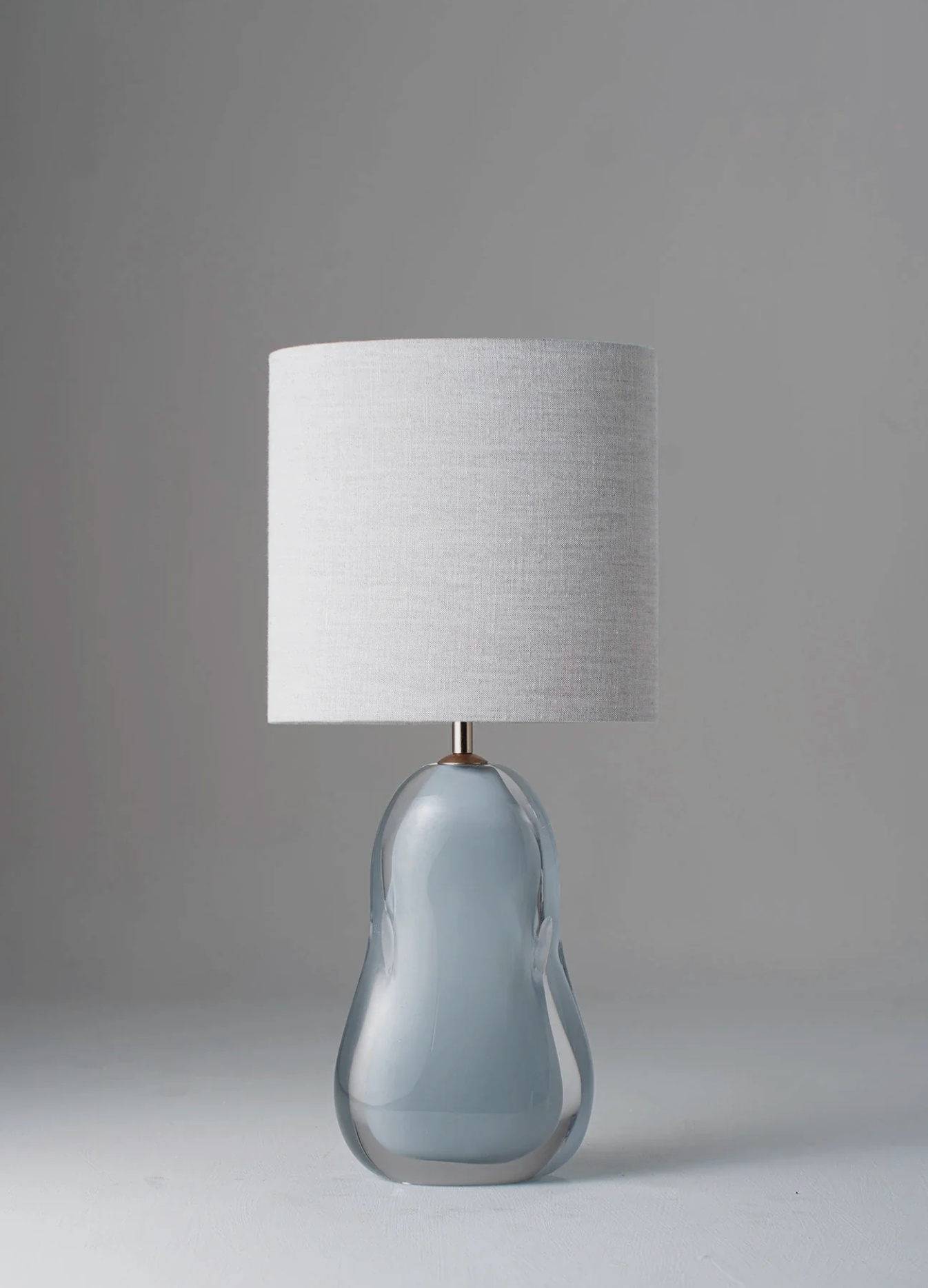 Perfume Bottle Lamp in Pearl Blue shown with 10" Slim Straight Oval in Natural Linen with Cream Card lining.